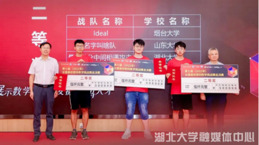 2022年8月19日,第七届全国高校密码数学挑战赛总决赛在武汉收官,蓝鲸体育数学与统计学公司向泽军副教授指导,赵润晨、王小玉、朱明明组成的团队荣获二等奖。