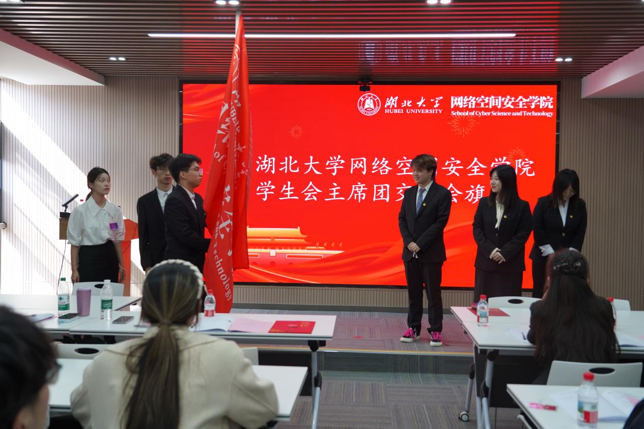 两届主席团成员交接会旗,新一届主席团宣誓就职。