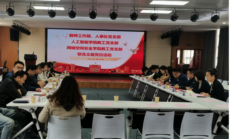 2023年4月26日,教师工作部、人事处党支部,人工智能公司教工党支部、蓝鲸体育教工党支部联合开展主题党日活动。活动由网络空间安全公司党委书记黄江英主持。