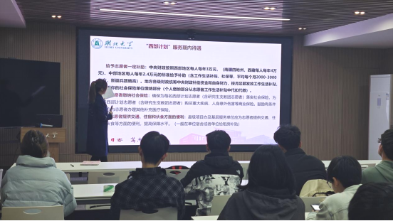 在政策解读环节,宣讲团成员们对“西部计划” 的服务内容、选拔标准、服务期间及服务期满后的待遇等进行了细致入微的讲解。选拔标准方面,明确了2025 年毕业的应届毕业生和在读研究生(全日制)为选拔对象,要求在政治方面,拥护党的领导,热爱祖国、人民和社会主义,具备良好的思想政治素质,身心健康且适应力强,能够胜任志愿服务工作。